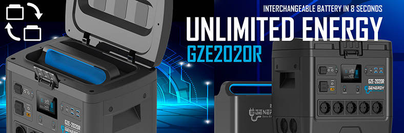 Em particular, a estação de energia portátil GZE-2020R é o primeiro gerador solar do mundo com baterias portáteis intercambiáveis. A troca de bateria leva apenas 7 segundos. Quando a bateria perde eficiência, basta substituí-la, mantendo o mesmo gerador base que é duradouro.