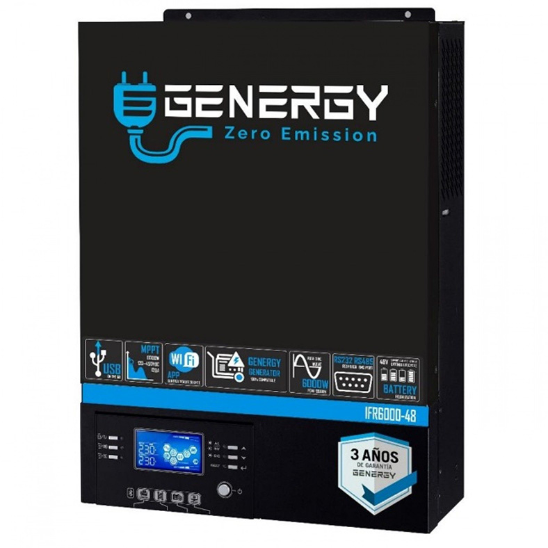 O inversor/carregador multifuncional da Genergy combina funções de inversor, controlador de carga solar MPPT e carregador para fornecer suporte de energia ininterrupta num tamanho adequado para transporte. O seu ecrã oferece botões de fácil acesso configuráveis pelo utilizador que permitem gerir a corrente de carga da bateria, a prioridade AC/Solar e escolher a voltagem de entrada aceitável com base em diferentes aplicações.